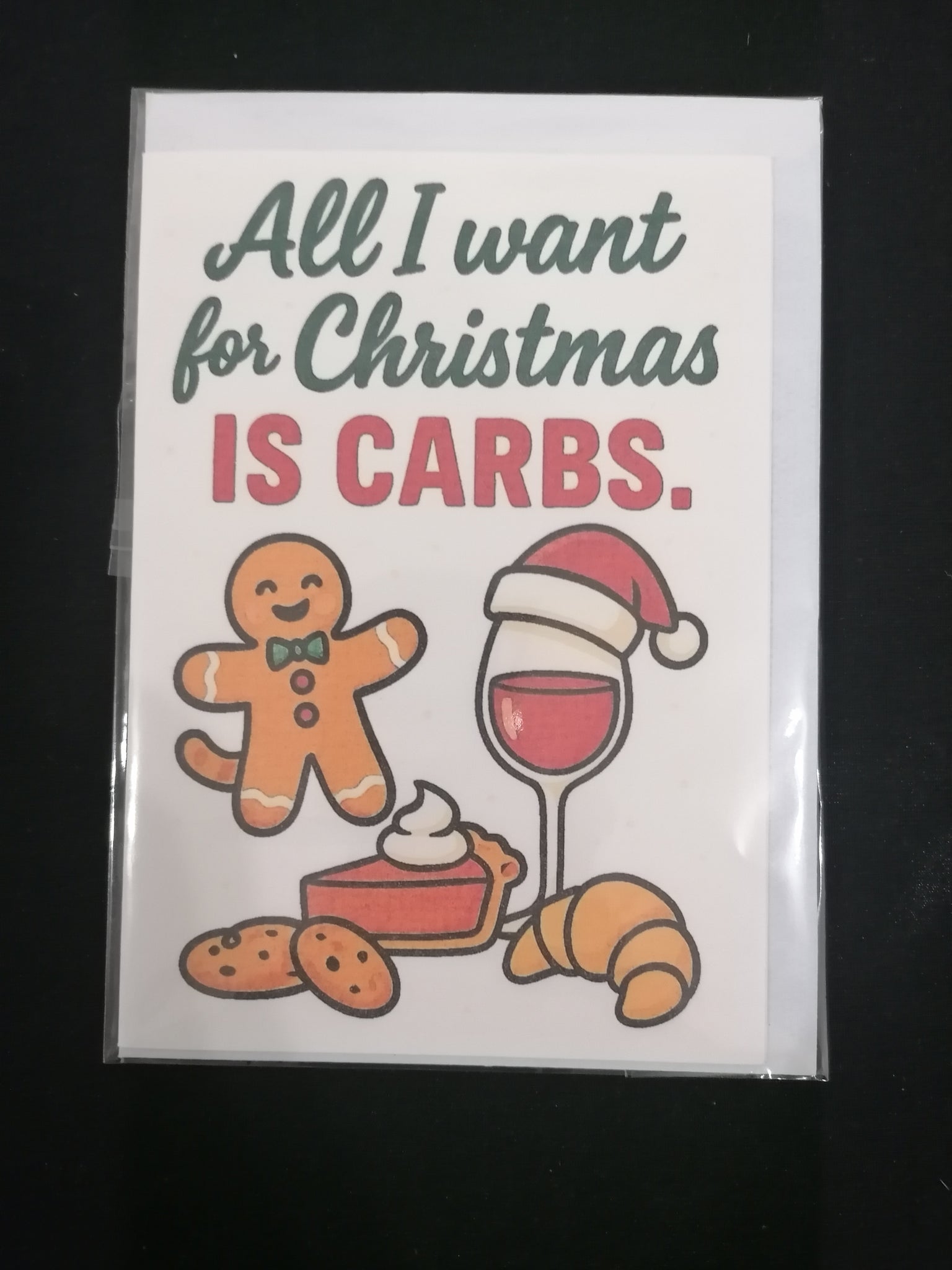Celebrate the season with a hearty dose of humor and holiday indulgence! These 5x7 Christmas card features a playful illustration of everyone's favorite festive—from gingerbread men and buttery croissants to pie, cookies, and even a glass of wine in a Santa hat. The bold red and green typography delivers the cheeky messages,